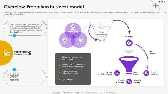 This slide presents an overview of freemium a digital business model that encourages awareness and trial of a service, so that more people convert overall. It includes overview, and differentiates between free and premium version of product or services.Are you searching for a Overview Freemium Business Model DT SS V that is uncluttered, straightforward, and original Its easy to edit, and you can change the colors to suit your personal or business branding. For a presentation that expresses how much effort you have put in, this template is ideal With all of its features, including tables, diagrams, statistics, and lists, its perfect for a business plan presentation. Make your ideas more appealing with these professional slides. Download Overview Freemium Business Model DT SS V from Slidegeeks today.