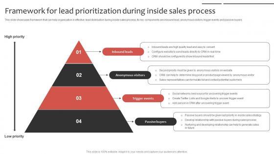 This slide showcases framework that can help organization in effective lead distribution during inside sales process. Its key components are inbound lead, anonymous visitors, trigger events and passive buyers. Are you in need of a template that can accommodate all of your creative concepts This one is crafted professionally and can be altered to fit any style. Use it with Google Slides or PowerPoint. Include striking photographs, symbols, depictions, and other visuals. Fill, move around, or remove text boxes as desired. Test out color palettes and font mixtures. Edit and save your work, or work with colleagues. Download Phone Sales Strategy To Drive Framework For Lead Prioritization During Inside Strategy SS V and observe how to make your presentation outstanding. Give an impeccable presentation to your group and make your presentation unforgettable.