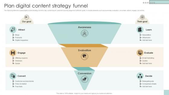 The following slide showcases digital content strategy funnel to map content as per customers journey stage and fulfill their goals. It includes elements such as awareness, evaluation, conversion, attract, engage, convert etc. Boost your pitch with our creative Plan Digital Content Strategy Funnel Developing And Creating Digital Content Strategy SS V. Deliver an awe-inspiring pitch that will mesmerize everyone. Using these presentation templates you will surely catch everyones attention. You can browse the ppts collection on our website. We have researchers who are experts at creating the right content for the templates. So you do not have to invest time in any additional work. Just grab the template now and use them.