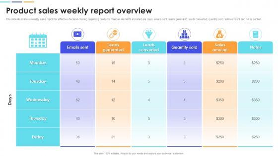 Find highly impressive Product Sales Weekly Report Overview on Slidegeeks to deliver a meaningful presentation. You can save an ample amount of time using these presentation templates. No need to worry to prepare everything from scratch because Slidegeeks experts have already done a huge research and work for you. You need to download Product Sales Weekly Report Overview for your upcoming presentation. All the presentation templates are 100 percent editable and you can change the color and personalize the content accordingly. Download now