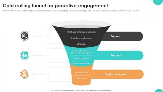 This slide exhibits a strategic cold-calling funnel which includes a series of steps designed for proactive outreach and engagement. It includes essentials such as prepare, prospect, and begin sales cycle. Get a simple yet stunning designed Ultimate Guide To Cold Calling Funnel For Proactive Engagement SA SS V. It is the best one to establish the tone in your meetings. It is an excellent way to make your presentations highly effective. So, download this PPT today from Slidegeeks and see the positive impacts. Our easy-to-edit Ultimate Guide To Cold Calling Funnel For Proactive Engagement SA SS V can be your go-to option for all upcoming conferences and meetings. So, what are you waiting for Grab this template today.