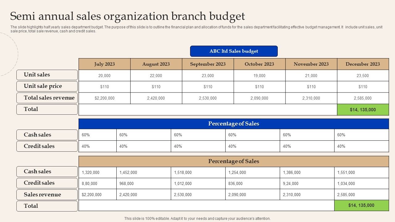 The slide highlights half yearly sales department budget. The purpose of this slide is to outline the financial plan and allocation of funds for the sales department facilitating effective budget management. It include unit sales, unit sale price, total sale revenue, cash and credit sales. Showcasing this set of slides titled Semi Annual Sales Organization Branch Budget Introduction PDF. The topics addressed in these templates are Sales Revenue, Cash Sales, Credit Sales. All the content presented in this PPT design is completely editable. Download it and make adjustments in color, background, font etc. as per your unique business setting.