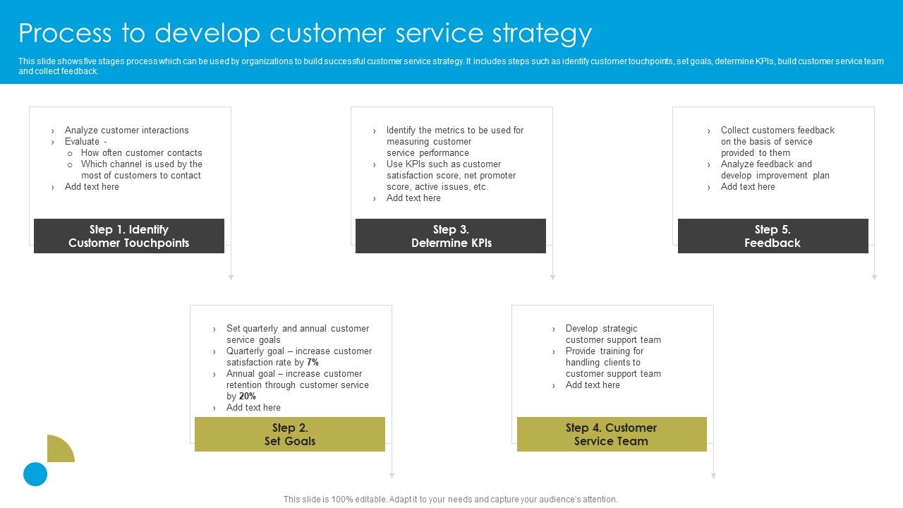 This slide shows five stages process which can be used by organizations to build successful customer service strategy. It includes steps such as identify customer touchpoints, set goals, determine KPIs, build customer service team and collect feedback. Are you searching for a Service Strategy Guide To Maximize Customer Experience Process To Develop Customer Service Strategy Background PDF that is uncluttered, straightforward, and original Its easy to edit, and you can change the colors to suit your personal or business branding. For a presentation that expresses how much effort you have put in, this template is ideal. With all of its features, including tables, diagrams, statistics, and lists, its perfect for a business plan presentation. Make your ideas more appealing with these professional slides. Download Service Strategy Guide To Maximize Customer Experience Process To Develop Customer Service Strategy Background PDF from Slidegeeks today.