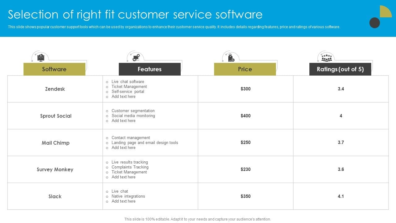 This slide shows popular customer support tools which can be used by organizations to enhance their customer service quality. It includes details regarding features, price and ratings of various software. Here you can discover an assortment of the finest PowerPoint and Google Slides templates. With these templates, you can create presentations for a variety of purposes while simultaneously providing your audience with an eye catching visual experience. Download Service Strategy Guide To Maximize Customer Experience Selection Of Right Fit Customer Service Software Introduction PDF to deliver an impeccable presentation. These templates will make your job of preparing presentations much quicker, yet still, maintain a high level of quality. Slidegeeks has experienced researchers who prepare these templates and write high quality content for you. Later on, you can personalize the content by editing the Service Strategy Guide To Maximize Customer Experience Selection Of Right Fit Customer Service Software Introduction PDF.