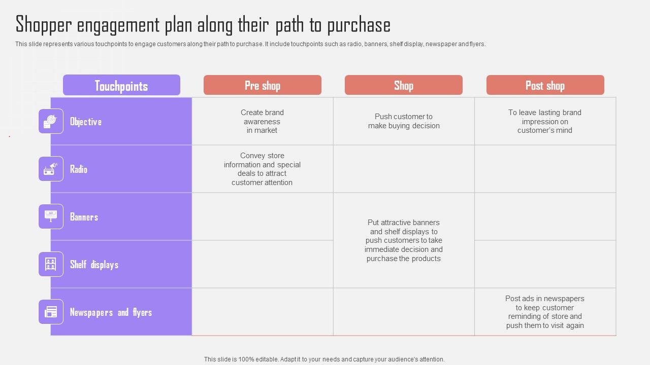 This slide represents various touchpoints to engage customers along their path to purchase. It include touchpoints such as radio, banners, shelf display, newspaper and flyers. This Shopper Engagement Plan Along Their Path Purchase Optimizing Customer Purchase Experience By Executing Download PDF from Slidegeeks makes it easy to present information on your topic with precision. It provides customization options, so you can make changes to the colors, design, graphics, or any other component to create a unique layout. It is also available for immediate download, so you can begin using it right away. Slidegeeks has done good research to ensure that you have everything you need to make your presentation stand out. Make a name out there for a brilliant performance.