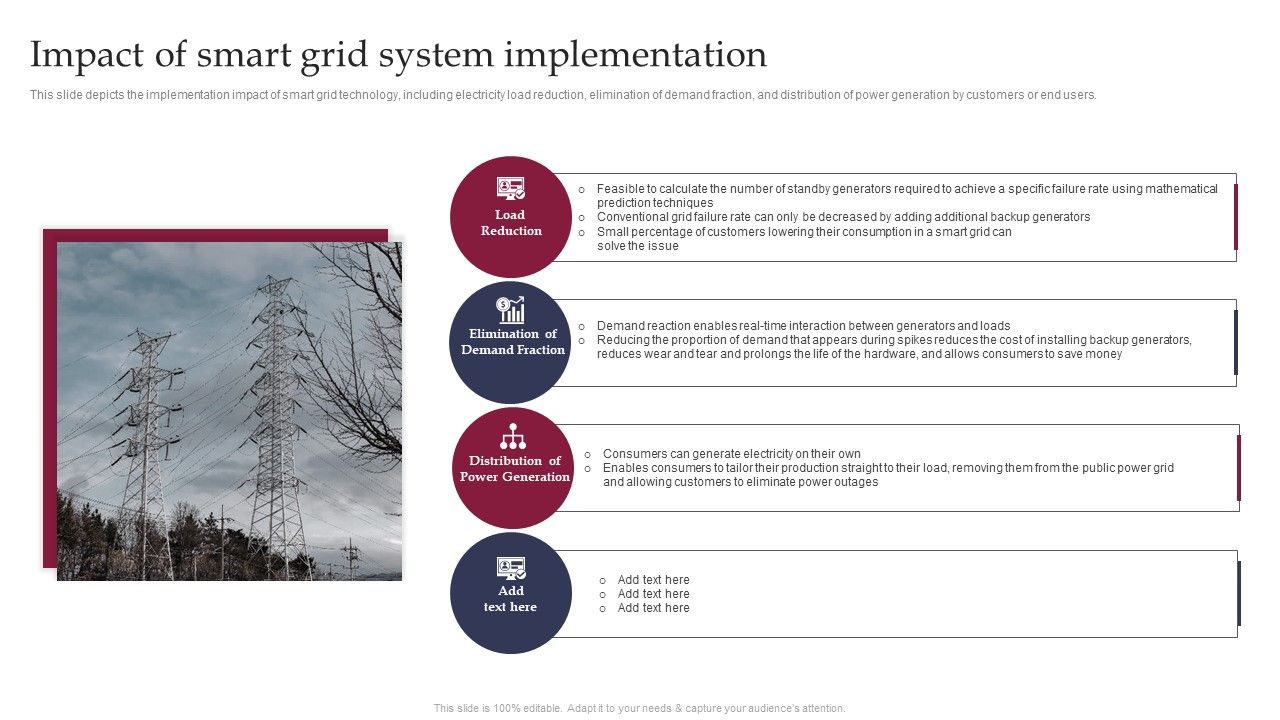 This slide depicts the implementation impact of smart grid technology, including electricity load reduction, elimination of demand fraction, and distribution of power generation by customers or end users. Get a simple yet stunning designed Smart Grid Technology Impact Of Smart Grid System Implementation Microsoft PDF. It is the best one to establish the tone in your meetings. It is an excellent way to make your presentations highly effective. So, download this PPT today from Slidegeeks and see the positive impacts. Our easy to edit Smart Grid Technology Impact Of Smart Grid System Implementation Microsoft PDF can be your go to option for all upcoming conferences and meetings. So, what are you waiting for Grab this template today.