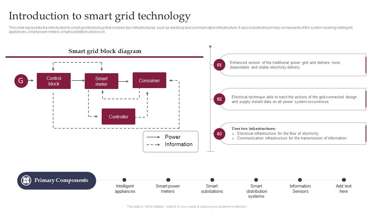 This slide depicts the infrastructure of smart grid technology divided into four sections, such as energy production, transmission and distribution, residential and commercial and industrial. The other components include smart meters, smart substations, and so on. Coming up with a presentation necessitates that the majority of the effort goes into the content and the message you intend to convey. The visuals of a PowerPoint presentation can only be effective if it supplements and supports the story that is being told. Keeping this in mind our experts created Smart Grid Technology Introduction To Smart Grid Technology Template PDF to reduce the time that goes into designing the presentation. This way, you can concentrate on the message while our designers take care of providing you with the right template for the situation.