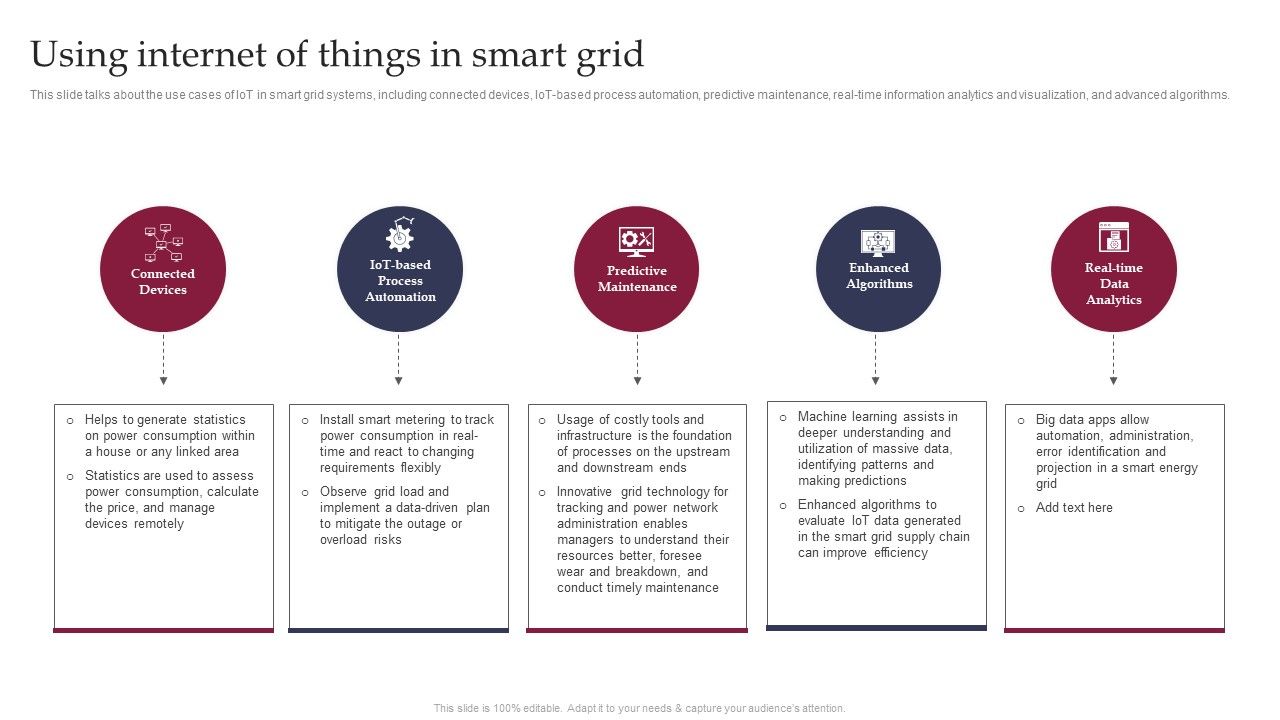This slide talks about the use cases of IoT in smart grid systems, including connected devices, IoT-based process automation, predictive maintenance, real-time information analytics and visualization, and advanced algorithms. Slidegeeks has constructed Smart Grid Technology Using Internet Of Things In Smart Grid Introduction PDF after conducting extensive research and examination. These presentation templates are constantly being generated and modified based on user preferences and critiques from editors. Here, you will find the most attractive templates for a range of purposes while taking into account ratings and remarks from users regarding the content. This is an excellent jumping off point to explore our content and will give new users an insight into our top notch PowerPoint Templates.
