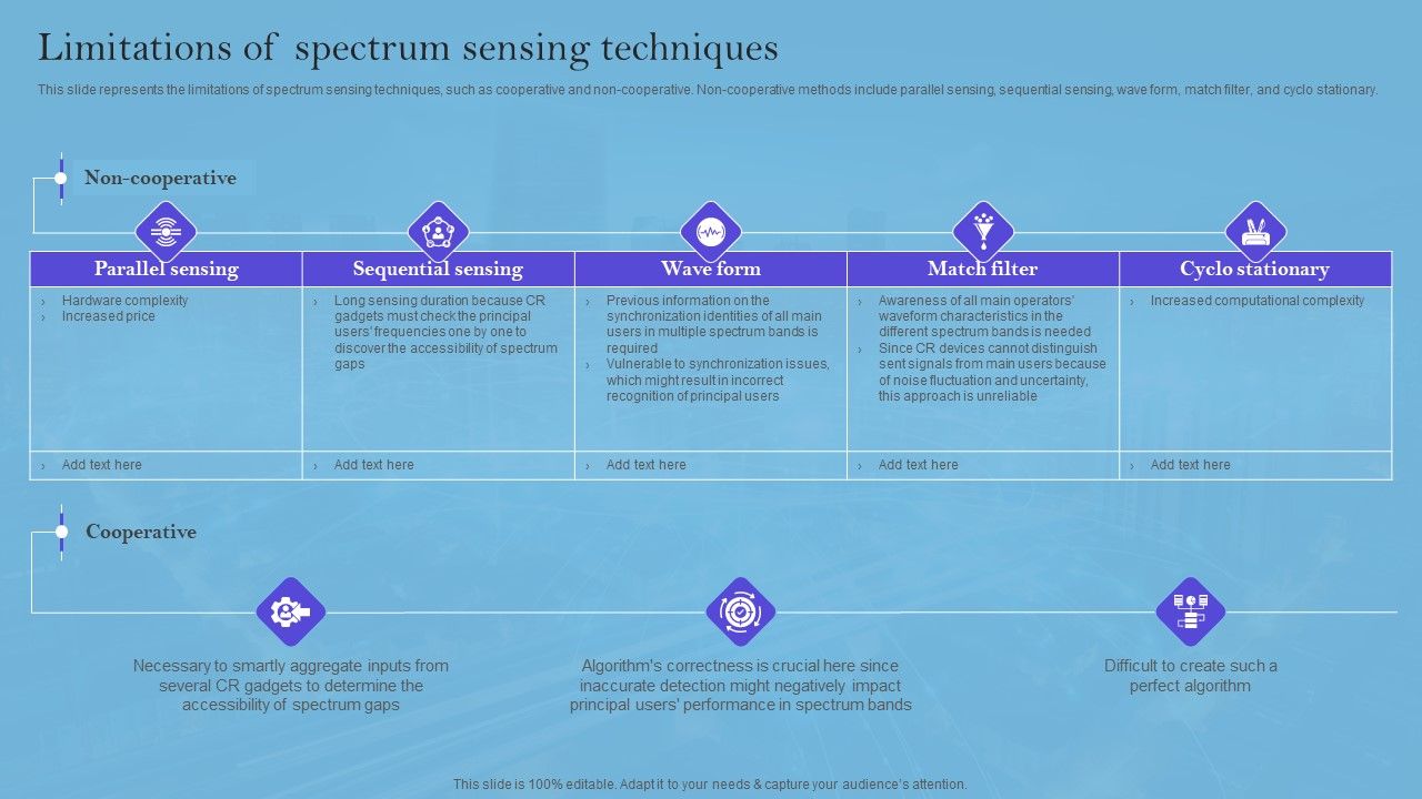 This slide represents the limitations of spectrum sensing techniques, such as cooperative and non-cooperative. Non-cooperative methods include parallel sensing, sequential sensing, wave form, match filter, and cyclo stationary. Make sure to capture your audiences attention in your business displays with our gratis customizable Smart Wireless Sensor Networks Limitations Of Spectrum Sensing Techniques Designs PDF. These are great for business strategies, office conferences, capital raising or task suggestions. If you desire to acquire more customers for your tech business and ensure they stay satisfied, create your own sales presentation with these plain slides.