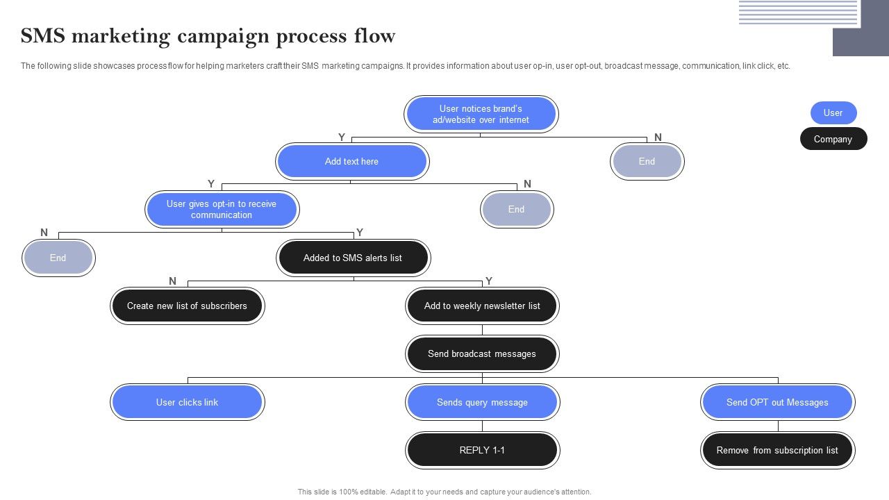 The following slide showcases process flow for helping marketers craft their SMS marketing campaigns. It provides information about user op-in, user opt-out, broadcast message, communication, link click, etc. Find highly impressive SMS Marketing Campaign Process Flow Ppt PowerPoint Presentation File Outline PDF on Slidegeeks to deliver a meaningful presentation. You can save an ample amount of time using these presentation templates. No need to worry to prepare everything from scratch because Slidegeeks experts have already done a huge research and work for you. You need to download SMS Marketing Campaign Process Flow Ppt PowerPoint Presentation File Outline PDF for your upcoming presentation. All the presentation templates are 100 percent editable and you can change the color and personalize the content accordingly. Download now.