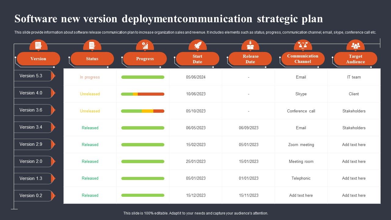 This slide provide information about software release communication plan to increase organization sales and revenue. It includes elements such as status, progress, communication channel, email, skype, conference call etc. Pitch your topic with ease and precision using this Software New Version Deploymentcommunication Strategic Plan Topics PDF. This layout presents information on Version, Status, Progress . It is also available for immediate download and adjustment. So, changes can be made in the color, design, graphics or any other component to create a unique layout.