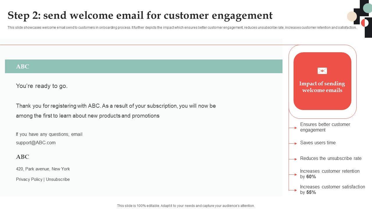 This slide showcases welcome email send to customers in onboarding process. It further depicts the impact which ensures better customer engagement, reduces unsubscribe rate, increases customer retention and satisfaction. The best PPT templates are a great way to save time, energy, and resources. Slidegeeks have 100 percent editable powerpoint slides making them incredibly versatile. With these quality presentation templates, you can create a captivating and memorable presentation by combining visually appealing slides and effectively communicating your message. Download Step 2 Send Welcome Email For Customer Engagement Designs PDF from Slidegeeks and deliver a wonderful presentation.