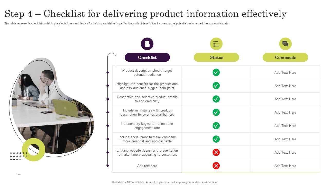 This slide represents checklist containing key techniques and tactics for building and delivering effective product description. It covers target potential customer, address pain points etc. The Step 4 Checklist For Delivering Product Information Effectively Elements PDF is a compilation of the most recent design trends as a series of slides. It is suitable for any subject or industry presentation, containing attractive visuals and photo spots for businesses to clearly express their messages. This template contains a variety of slides for the user to input data, such as structures to contrast two elements, bullet points, and slides for written information. Slidegeeks is prepared to create an impression.
