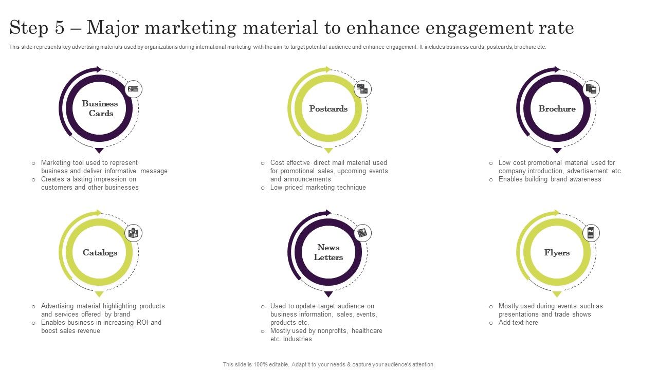 This slide represents key advertising materials used by organizations during international marketing with the aim to target potential audience and enhance engagement. It includes business cards, postcards, brochure etc. Are you searching for a Step 5 Major Marketing Material To Enhance Engagement Rate Clipart PDF that is uncluttered, straightforward, and original Its easy to edit, and you can change the colors to suit your personal or business branding. For a presentation that expresses how much effort you have put in, this template is ideal With all of its features, including tables, diagrams, statistics, and lists, its perfect for a business plan presentation. Make your ideas more appealing with these professional slides. Download Step 5 Major Marketing Material To Enhance Engagement Rate Clipart PDF from Slidegeeks today.