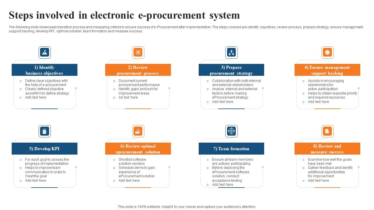 The following slide showcases transition process and measuring criteria to assure success of e Procurement after implementation. The steps covered are identify objectives, review process, prepare strategy, ensure management support backing, develop KPI, optimal solution, team formation and measure success. Persuade your audience using this Steps Involved In Electronic E Procurement System Microsoft PDF. This PPT design covers eight stages, thus making it a great tool to use. It also caters to a variety of topics including Prepare Procurement, Team Formation, Review Procurement Process. Download this PPT design now to present a convincing pitch that not only emphasizes the topic but also showcases your presentation skills.