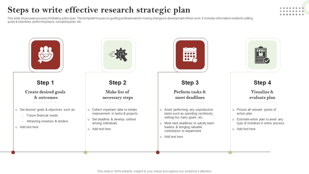 This slide showcases process of initiating action plan. This template focuses on guiding professionals for making changes in development of their work. It includes information related to setting goals and objectives, performing tasks, visualizing plan, etc. Presenting Steps To Write Effective Research Strategic Plan Diagrams PDF to dispense important information. This template comprises four stages. It also presents valuable insights into the topics including Create Desired Goals Outcomes, Perform Tasks Meet Deadlines, Visualize And Evaluate Plan. This is a completely customizable PowerPoint theme that can be put to use immediately. So, download it and address the topic impactfully.