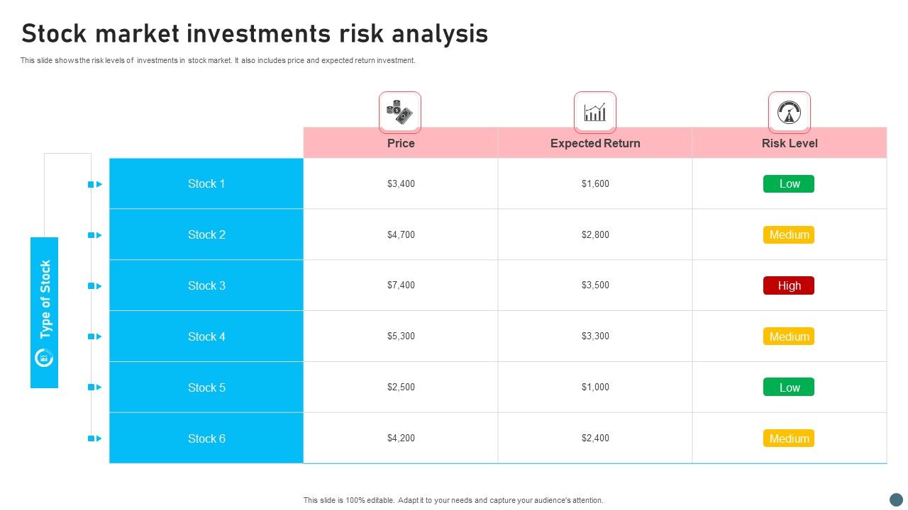 This slide shows the risk levels of investments in stock market. It also includes price and expected return investment. Showcasing this set of slides titled Stock Market Investments Risk Analysis Sample PDF. The topics addressed in these templates are Analysis, Stock, Investments. All the content presented in this PPT design is completely editable. Download it and make adjustments in color, background, font etc. as per your unique business setting.