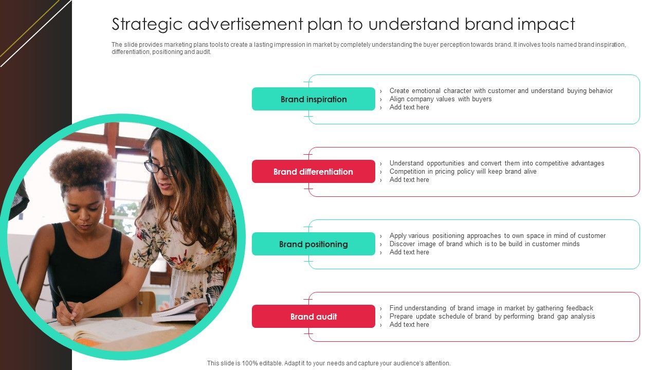 The slide provides marketing plans tools to create a lasting impression in market by completely understanding the buyer perception towards brand. It involves tools named brand inspiration, differentiation, positioning and audit. Presenting Strategic Advertisement Plan To Understand Brand Impact Introduction PDF to dispense important information. This template comprises four stages. It also presents valuable insights into the topics including Brand Inspiration, Brand Differentiation, Brand Positioning. This is a completely customizable PowerPoint theme that can be put to use immediately. So, download it and address the topic impactfully.