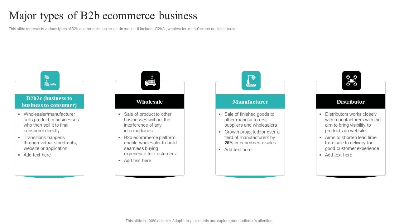 This slide represents various types of B2b ecommerce businesses in market. It includes B2b2c, wholesaler, manufacturer and distributor. Crafting an eye-catching presentation has never been more straightforward. Let your presentation shine with this tasteful yet straightforward Strategic Ecommerce Plan For B2B Enterprises Major Types Of B2b Ecommerce Business Slides PDF template. It offers a minimalistic and classy look that is great for making a statement. The colors have been employed intelligently to add a bit of playfulness while still remaining professional. Construct the ideal Strategic Ecommerce Plan For B2B Enterprises Major Types Of B2b Ecommerce Business Slides PDF that effortlessly grabs the attention of your audience Begin now and be certain to wow your customers