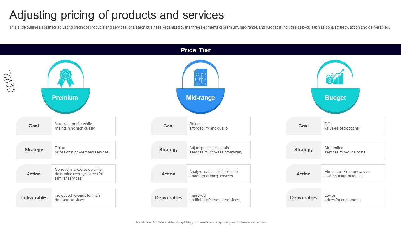 This slide outlines a plan for adjusting pricing of products and services for a salon business, organized by the three segments of premium, mid-range, and budget. It includes aspects such as goal, strategy, action and deliverables. Create an editable Strategic Marketing For Hair And Beauty Salon To Increase Adjusting Pricing Of Products Topics PDF that communicates your idea and engages your audience. Whether youre presenting a business or an educational presentation, pre designed presentation templates help save time. Strategic Marketing For Hair And Beauty Salon To Increase Adjusting Pricing Of Products Topics PDF is highly customizable and very easy to edit, covering many different styles from creative to business presentations. Slidegeeks has creative team members who have crafted amazing templates. So, go and get them without any delay.