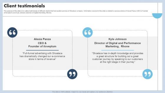 The purpose of this slide is to outline testimonials of different clients that had availed services of Shoelace company. Information covered in this slide is related to success stories of Alexia Panza CEO and Founder of iloveplum and Kyle Johnson Director of Digital Marketing, Rhone. Create an editable Client Testimonials Capital Raising Pitch Deck For Advertising Services PPT Presentation that communicates your idea and engages your audience. Whether you are presenting a business or an educational presentation, pre-designed presentation templates help save time. Client Testimonials Capital Raising Pitch Deck For Advertising Services PPT Presentation is highly customizable and very easy to edit, covering many different styles from creative to business presentations. Slidegeeks has creative team members who have crafted amazing templates. So, go and get them without any delay.