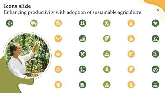 Introducing our well designed Icons Slide Enhancing Productivity With Adoption Of Sustainable Agriculture PPT PowerPoint set of slides. The slide displays editable icons to enhance your visual presentation. The icons can be edited easily. So customize according to your business to achieve a creative edge. Download and share it with your audience.
