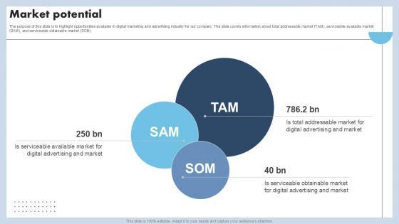 The purpose of this slide is to highlight opportunities available in digital marketing and advertising industry for our company. The slide covers information about total addressable market TAM, serviceable available market SAM, and serviceable obtainable market SOM. If you are looking for a format to display your unique thoughts, then the professionally designed Market Potential Capital Raising Pitch Deck For Advertising Services PPT Template is the one for you. You can use it as a Google Slides template or a PowerPoint template. Incorporate impressive visuals, symbols, images, and other charts. Modify or reorganize the text boxes as you desire. Experiment with shade schemes and font pairings. Alter, share or cooperate with other people on your work. Download Market Potential Capital Raising Pitch Deck For Advertising Services PPT Template and find out how to give a successful presentation. Present a perfect display to your team and make your presentation unforgettable.