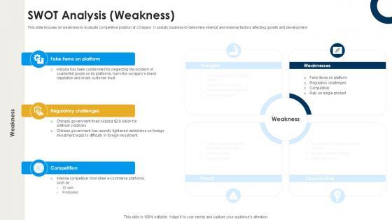 This slide focuses on weakness to evaluate competitive position of company. It assists business to determine internal and external factors affecting growth and development. Slidegeeks is one of the best resources for PowerPoint templates. You can download easily and regulate SWOT Analysis Weakness International Trade Of Products And Services PPT Sample CP SS V for your personal presentations from our wonderful collection. A few clicks is all it takes to discover and get the most relevant and appropriate templates. Use our Templates to add a unique zing and appeal to your presentation and meetings. All the slides are easy to edit and you can use them even for advertisement purposes.
