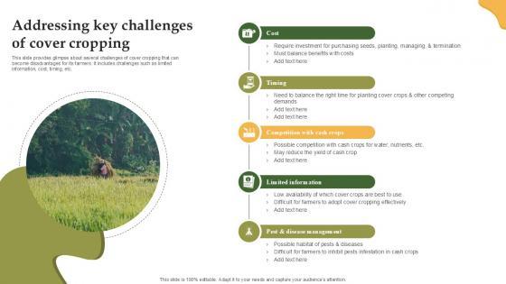 This slide provides glimpse about several challenges of cover cropping that can become disadvantages for its farmers. It includes challenges such as limited information, cost, timing, etc. Find a pre-designed and impeccable Addressing Key Challenges Of Cover Enhancing Productivity With Adoption PPT Sample. The templates can ace your presentation without additional effort. You can download these easy-to-edit presentation templates to make your presentation stand out from others. So, what are you waiting for Download the template from Slidegeeks today and give a unique touch to your presentation.