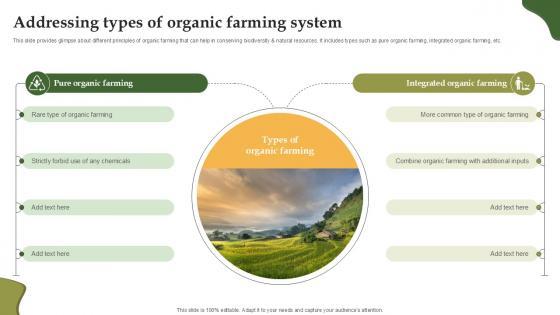 This slide provides glimpse about different principles of organic farming that can help in conserving biodiversity and natural resources. It includes types such as pure organic farming, integrated organic farming, etc. Present like a pro with Addressing Types Of Organic Enhancing Productivity With Adoption PPT PowerPoint. Create beautiful presentations together with your team, using our easy-to-use presentation slides. Share your ideas in real-time and make changes on the fly by downloading our templates. So whether you are in the office, on the go, or in a remote location, you can stay in sync with your team and present your ideas with confidence. With Slidegeeks presentation got a whole lot easier. Grab these presentations today.