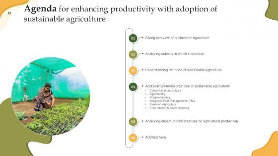 Slidegeeks is here to make your presentations a breeze with Agenda For Enhancing Productivity With Adoption Of Sustainable Agriculture PPT PowerPoint With our easy-to-use and customizable templates, you can focus on delivering your ideas rather than worrying about formatting. With a variety of designs to choose from, you are sure to find one that suits your needs. And with animations and unique photos, illustrations, and fonts, you can make your presentation pop. So whether you are giving a sales pitch or presenting to the board, make sure to check out Slidegeeks first