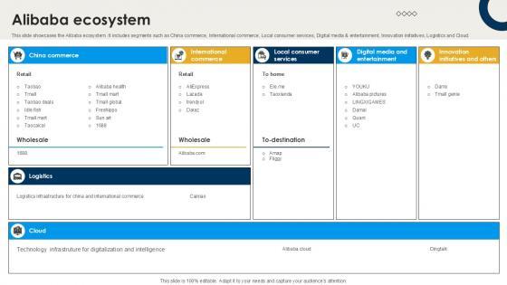This slide showcases the Alibaba ecosystem. It includes segments such as China commerce, International commerce, Local consumer services, Digital media and entertainment, Innovation initiatives, Logistics and Cloud. Find a pre-designed and impeccable Alibaba Ecosystem International Trade Of Products And Services PPT PowerPoint CP SS V. The templates can ace your presentation without additional effort. You can download these easy-to-edit presentation templates to make your presentation stand out from others. So, what are you waiting for Download the template from Slidegeeks today and give a unique touch to your presentation.