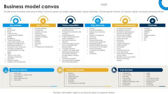 This slide focuses on business model canvas of Alibaba. It covers key partners, key activities, value proposition, customer relationships, customer segments, Channels, key resources, channels, cost structure and revenue streams. Slidegeeks is one of the best resources for PowerPoint templates. You can download easily and regulate Business Model Canvas International Trade Of Products And Services PPT Slide CP SS V for your personal presentations from our wonderful collection. A few clicks is all it takes to discover and get the most relevant and appropriate templates. Use our Templates to add a unique zing and appeal to your presentation and meetings. All the slides are easy to edit and you can use them even for advertisement purposes.