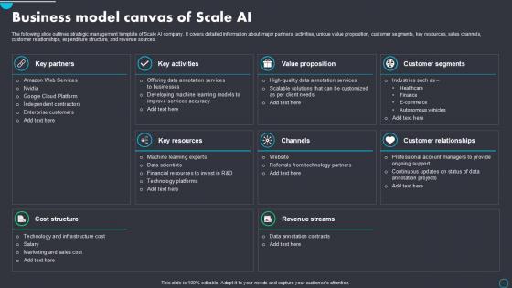 The following slide outlines strategic management template of Scale AI company. It covers detailed information about major partners, activities, unique value proposition, customer segments, key resources, sales channels, customer relationships, expenditure structure, and revenue sources. Boost your pitch with our creative Business Model Canvas Of Implementing Scale AI PPT Presentation AI SS V. Deliver an awe-inspiring pitch that will mesmerize everyone. Using these presentation templates you will surely catch everyones attention. You can browse the ppts collection on our website. We have researchers who are experts at creating the right content for the templates. So you do not have to invest time in any additional work. Just grab the template now and use them.