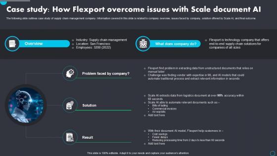 The following slide outlines case study of supply chain management company. Information covered in this slide is related to company overview, issues faced by company, solution offered by Scale AI, and final outcome. Create an editable Case Study How Flexport Overcome Implementing Scale AI PPT Template AI SS V that communicates your idea and engages your audience. Whether you are presenting a business or an educational presentation, pre-designed presentation templates help save time. Case Study How Flexport Overcome Implementing Scale AI PPT Template AI SS V is highly customizable and very easy to edit, covering many different styles from creative to business presentations. Slidegeeks has creative team members who have crafted amazing templates. So, go and get them without any delay.