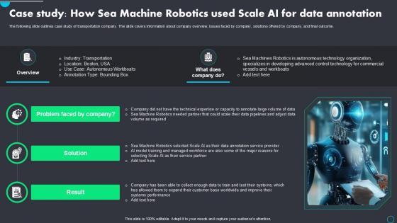 The following slide outlines case study of transportation company. The slide covers information about company overview, issues faced by company, solutions offered by company, and final outcome. Slidegeeks is one of the best resources for PowerPoint templates. You can download easily and regulate Case Study How Sea Machine Robotics Implementing Scale AI PPT Slide AI SS V for your personal presentations from our wonderful collection. A few clicks is all it takes to discover and get the most relevant and appropriate templates. Use our Templates to add a unique zing and appeal to your presentation and meetings. All the slides are easy to edit and you can use them even for advertisement purposes.