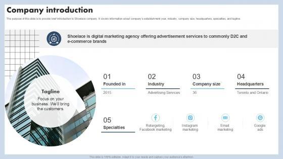 The purpose of this slide is to provide brief introduction to Shoelace company. It covers information about companys establishment year, industry, company size, headquarters, specialties, and tagline. Slidegeeks is one of the best resources for PowerPoint templates. You can download easily and regulate Company Introduction Capital Raising Pitch Deck For Advertising Services PPT Presentation for your personal presentations from our wonderful collection. A few clicks is all it takes to discover and get the most relevant and appropriate templates. Use our Templates to add a unique zing and appeal to your presentation and meetings. All the slides are easy to edit and you can use them even for advertisement purposes.