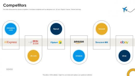 This slide showcases the Alibaba competitors. It includes companies such as aliexpress.com, JD.com, Flipkart, Amazon, Tencent and ebay. Present like a pro with Competitors International Trade Of Products And Services PPT Presentation CP SS V. Create beautiful presentations together with your team, using our easy-to-use presentation slides. Share your ideas in real-time and make changes on the fly by downloading our templates. So whether you are in the office, on the go, or in a remote location, you can stay in sync with your team and present your ideas with confidence. With Slidegeeks presentation got a whole lot easier. Grab these presentations today.