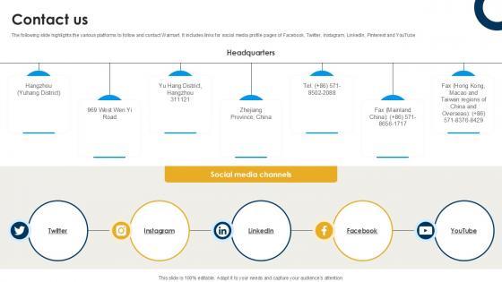 The following slide highlights the various platforms to follow and contact Walmart. It includes links for social media profile pages of Facebook, Twitter, Instagram, LinkedIn, Pinterest and YouTube. Slidegeeks is here to make your presentations a breeze with Contact Us International Trade Of Products And Services PPT Example CP SS V With our easy-to-use and customizable templates, you can focus on delivering your ideas rather than worrying about formatting. With a variety of designs to choose from, you are sure to find one that suits your needs. And with animations and unique photos, illustrations, and fonts, you can make your presentation pop. So whether you are giving a sales pitch or presenting to the board, make sure to check out Slidegeeks first