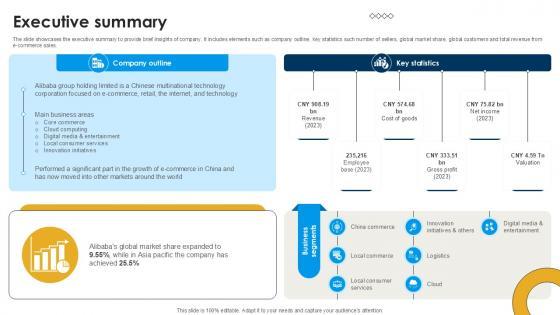 The slide showcases the executive summary to provide brief insights of company. It includes elements such as company outline, key statistics such number of sellers, global market share, global customers and total revenue from e-commerce sales. If your project calls for a presentation, then Slidegeeks is your go-to partner because we have professionally designed, easy-to-edit templates that are perfect for any presentation. After downloading, you can easily edit Executive Summary International Trade Of Products And Services PPT Sample CP SS V and make the changes accordingly. You can rearrange slides or fill them with different images. Check out all the handy templates