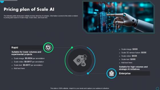 The following slide showcases multiple revenue streams of company. Information covered in this slide is related to pricing plan based on Scale image, Scale video, and Scale text. Present like a pro with Implementing Scale AI Pricing Plan Of Scale AI PPT Example AI SS V. Create beautiful presentations together with your team, using our easy-to-use presentation slides. Share your ideas in real-time and make changes on the fly by downloading our templates. So whether you are in the office, on the go, or in a remote location, you can stay in sync with your team and present your ideas with confidence. With Slidegeeks presentation got a whole lot easier. Grab these presentations today.