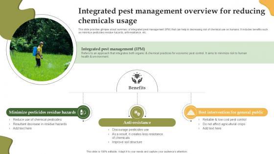 This slide provides glimpse about summary of integrated pest management IPM that can help in decreasing risk of chemical use on humans. It includes benefits such as minimize pesticides residue hazards, anti-resistance, etc. Slidegeeks is one of the best resources for PowerPoint templates. You can download easily and regulate Integrated Pest Management Overview Enhancing Productivity With Adoption PPT Example for your personal presentations from our wonderful collection. A few clicks is all it takes to discover and get the most relevant and appropriate templates. Use our Templates to add a unique zing and appeal to your presentation and meetings. All the slides are easy to edit and you can use them even for advertisement purposes.