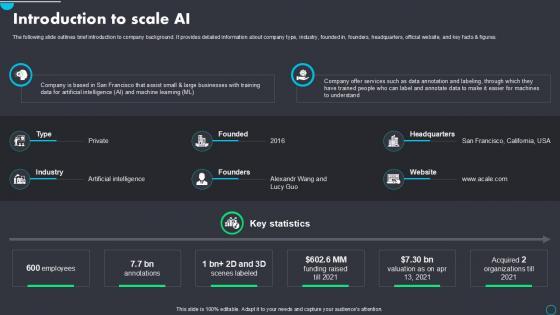 The following slide outlines brief introduction to company background. It provides detailed information about company type, industry, founded in, founders, headquarters, official website, and key facts and figures. Find highly impressive Introduction To Scale AI Implementing Scale AI PPT Example AI SS V on Slidegeeks to deliver a meaningful presentation. You can save an ample amount of time using these presentation templates. No need to worry to prepare everything from scratch because Slidegeeks experts have already done a huge research and work for you. You need to download Introduction To Scale AI Implementing Scale AI PPT Example AI SS V for your upcoming presentation. All the presentation templates are 100 percent editable and you can change the color and personalize the content accordingly. Download now