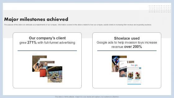 The purpose of this slide is to delineate accomplishments of our company. Information covered in this slide is related to how our company assists clients in increasing their revenue and expanding business. If your project calls for a presentation, then Slidegeeks is your go-to partner because we have professionally designed, easy-to-edit templates that are perfect for any presentation. After downloading, you can easily edit Major Milestones Achieved Capital Raising Pitch Deck For Advertising Services PPT Template and make the changes accordingly. You can rearrange slides or fill them with different images. Check out all the handy templates