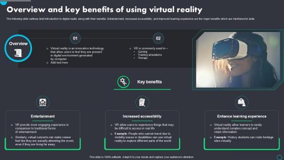 The following slide outlines brief introduction to digital reality along with their benefits. Entertainment, increased accessibility, and improved learning experience are the major benefits which are mentioned in slide. Explore a selection of the finest Overview And Key Benefits Of Using Virtual Implementing Scale AI PPT Presentation AI SS V here. With a plethora of professionally designed and pre-made slide templates, you can quickly and easily find the right one for your upcoming presentation. You can use our Overview And Key Benefits Of Using Virtual Implementing Scale AI PPT Presentation AI SS V to effectively convey your message to a wider audience. Slidegeeks has done a lot of research before preparing these presentation templates. The content can be personalized and the slides are highly editable. Grab templates today from Slidegeeks.