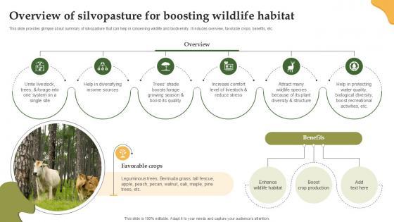This slide provides glimpse about summary of silvopasture that can help in conserving wildlife and biodiversity. It includes overview, favorable crops, benefits, etc. Are you in need of a template that can accommodate all of your creative concepts This one is crafted professionally and can be altered to fit any style. Use it with Google Slides or PowerPoint. Include striking photographs, symbols, depictions, and other visuals. Fill, move around, or remove text boxes as desired. Test out color palettes and font mixtures. Edit and save your work, or work with colleagues. Download Overview Of Silvopasture For Enhancing Productivity With Adoption PPT Template and observe how to make your presentation outstanding. Give an impeccable presentation to your group and make your presentation unforgettable.