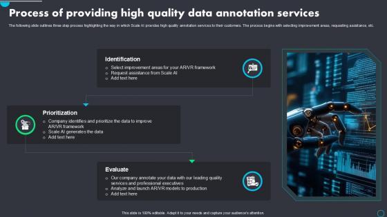 The following slide outlines three step process highlighting the way in which Scale AI provides high quality annotation services to their customers. The process begins with selecting improvement areas, requesting assistance, etc. The best PPT templates are a great way to save time, energy, and resources. Slidegeeks have 100 percent editable powerpoint slides making them incredibly versatile. With these quality presentation templates, you can create a captivating and memorable presentation by combining visually appealing slides and effectively communicating your message. Download Process Of Providing High Quality Data Implementing Scale AI PPT PowerPoint AI SS V from Slidegeeks and deliver a wonderful presentation.