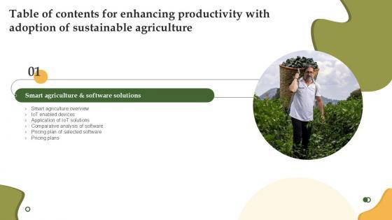 Welcome to our selection of the Table Of Contents For Enhancing Productivity With Adoption Of Sustainable PPT Template. These are designed to help you showcase your creativity and bring your sphere to life. Planning and Innovation are essential for any business that is just starting out. This collection contains the designs that you need for your everyday presentations. All of our PowerPoints are 100Percent editable, so you can customize them to suit your needs. This multi-purpose template can be used in various situations. Grab these presentation templates today.