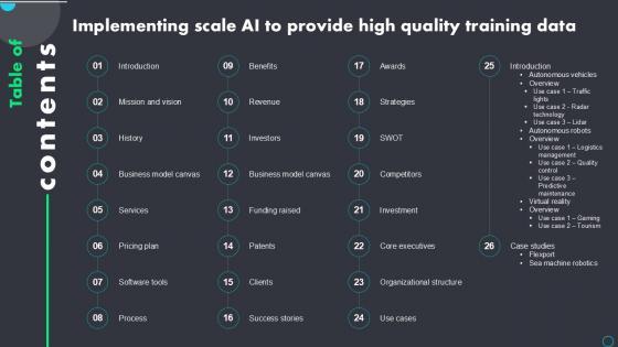 Retrieve professionally designed Table Of Content Implementing Scale AI To Provide High Quality Training Data PPT Presentation AI SS V to effectively convey your message and captivate your listeners. Save time by selecting pre-made slideshows that are appropriate for various topics, from business to educational purposes. These themes come in many different styles, from creative to corporate, and all of them are easily adjustable and can be edited quickly. Access them as PowerPoint templates or as Google Slides themes. You do not have to go on a hunt for the perfect presentation because Slidegeeks got you covered from everywhere.