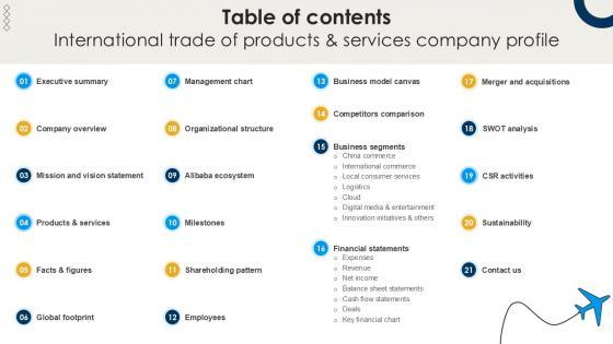 Want to ace your presentation in front of a live audience Our Table Of Contents International Trade Of Products And Services Company Profile PPT Sample CP SS V can help you do that by engaging all the users towards you. Slidegeeks experts have put their efforts and expertise into creating these impeccable powerpoint presentations so that you can communicate your ideas clearly. Moreover, all the templates are customizable, and easy-to-edit and downloadable. Use these for both personal and commercial use.